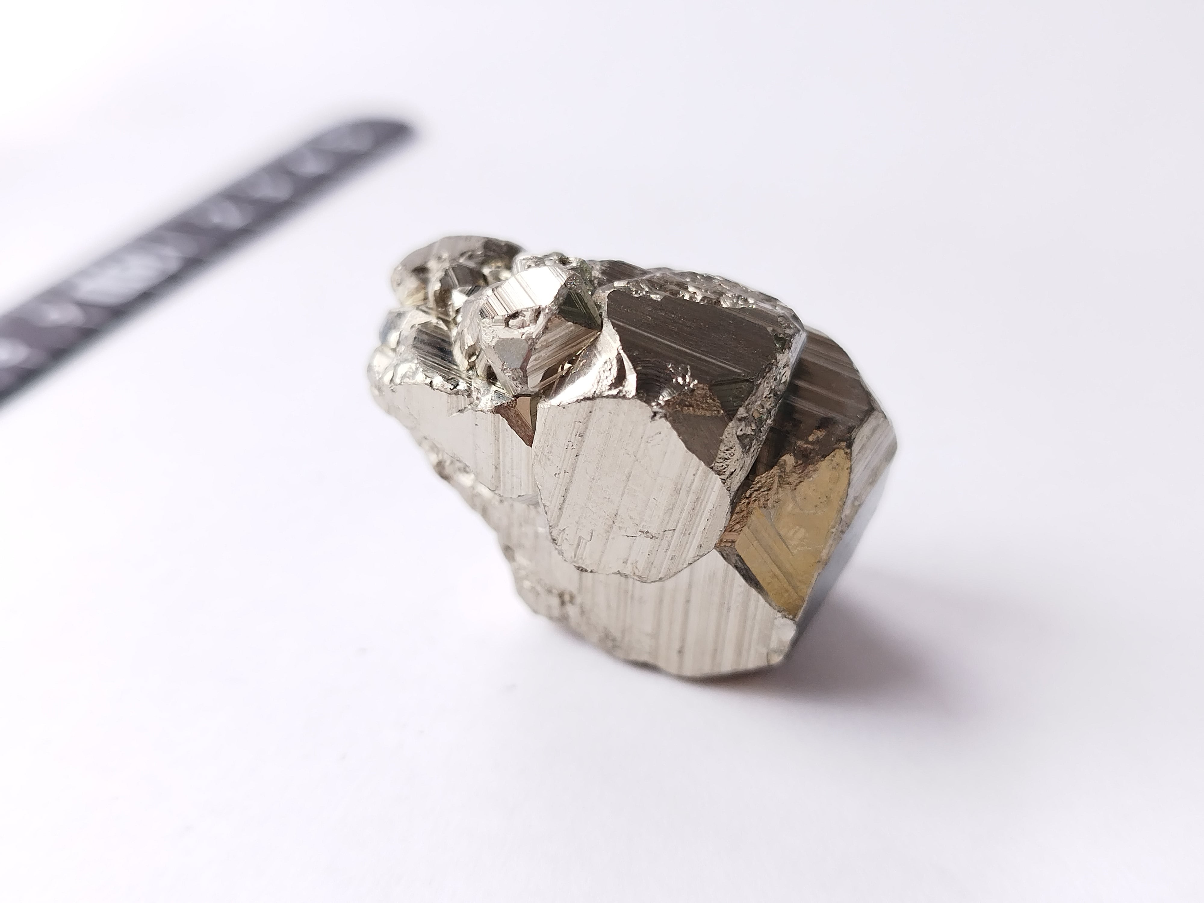 硫黄と鉄の化合物。黄金色の美しい光沢および、立方体、五画十二面体、八面体、二十四面体、又はそれらが合わさった形など様々な結晶をするので標本として人気があります。