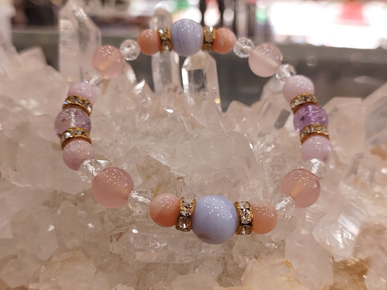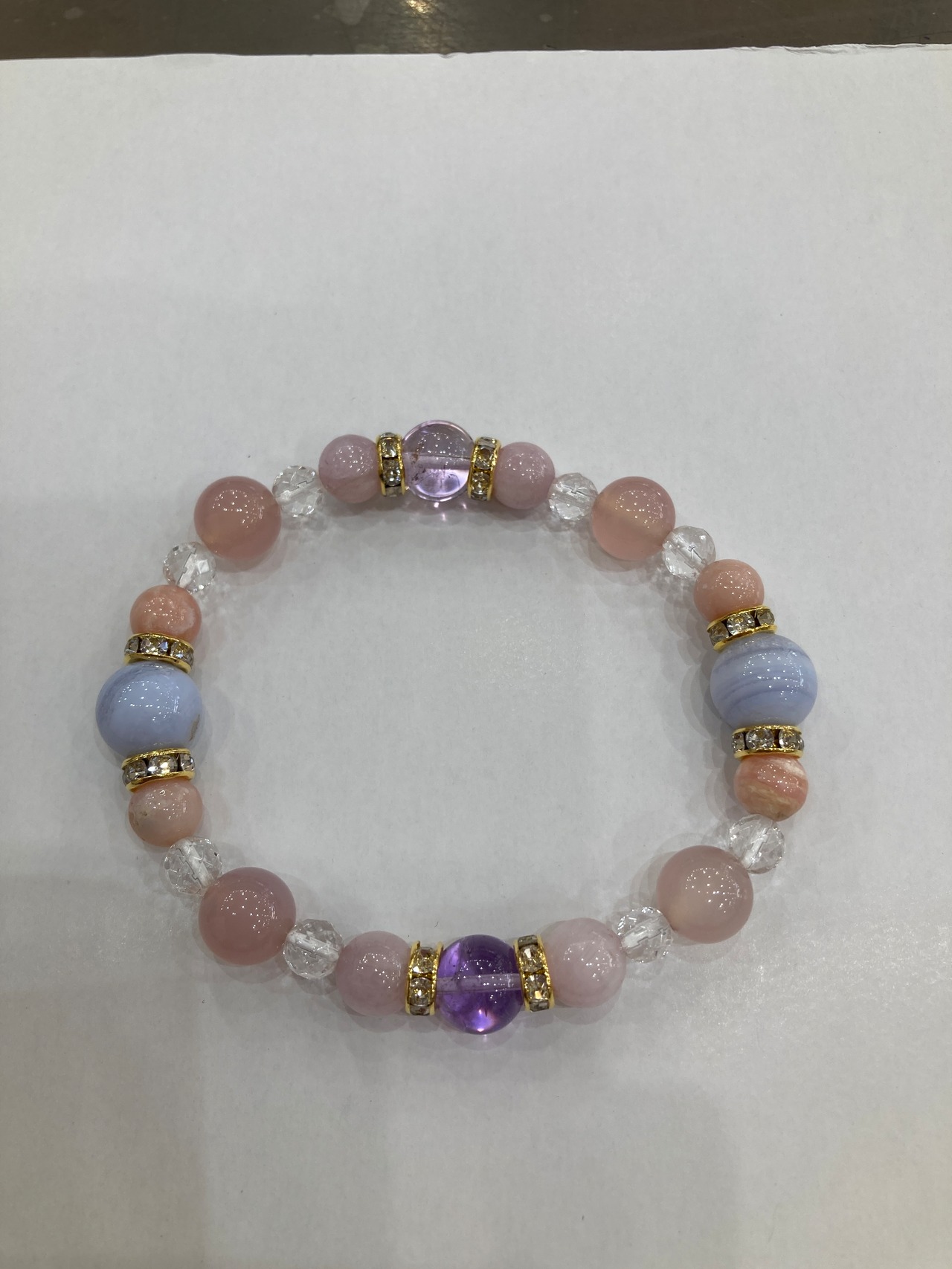 【E25542】オリジナルブレスレット アメシスト ブルーレースアゲート ピンクオパール エンジェルシリカ クンツァイト カット水晶