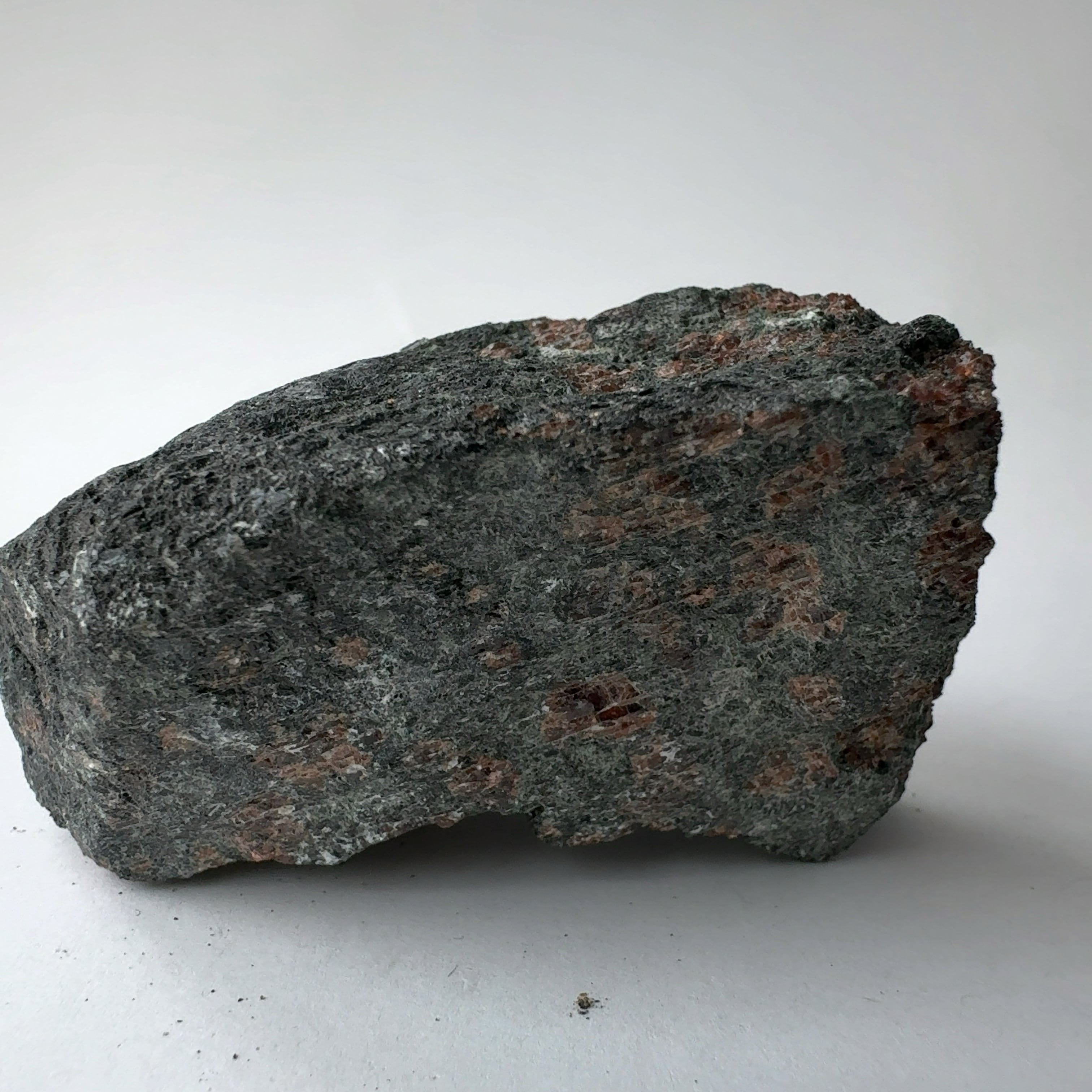 深海の地殻が地球内部に沈み込み地球の深いところ(マントル上部)の高温高圧のもとでできた変成岩でザクロ石や輝石を主体とする岩石。世界的にも希な岩石で、地球内部の研究には欠かすことができません。