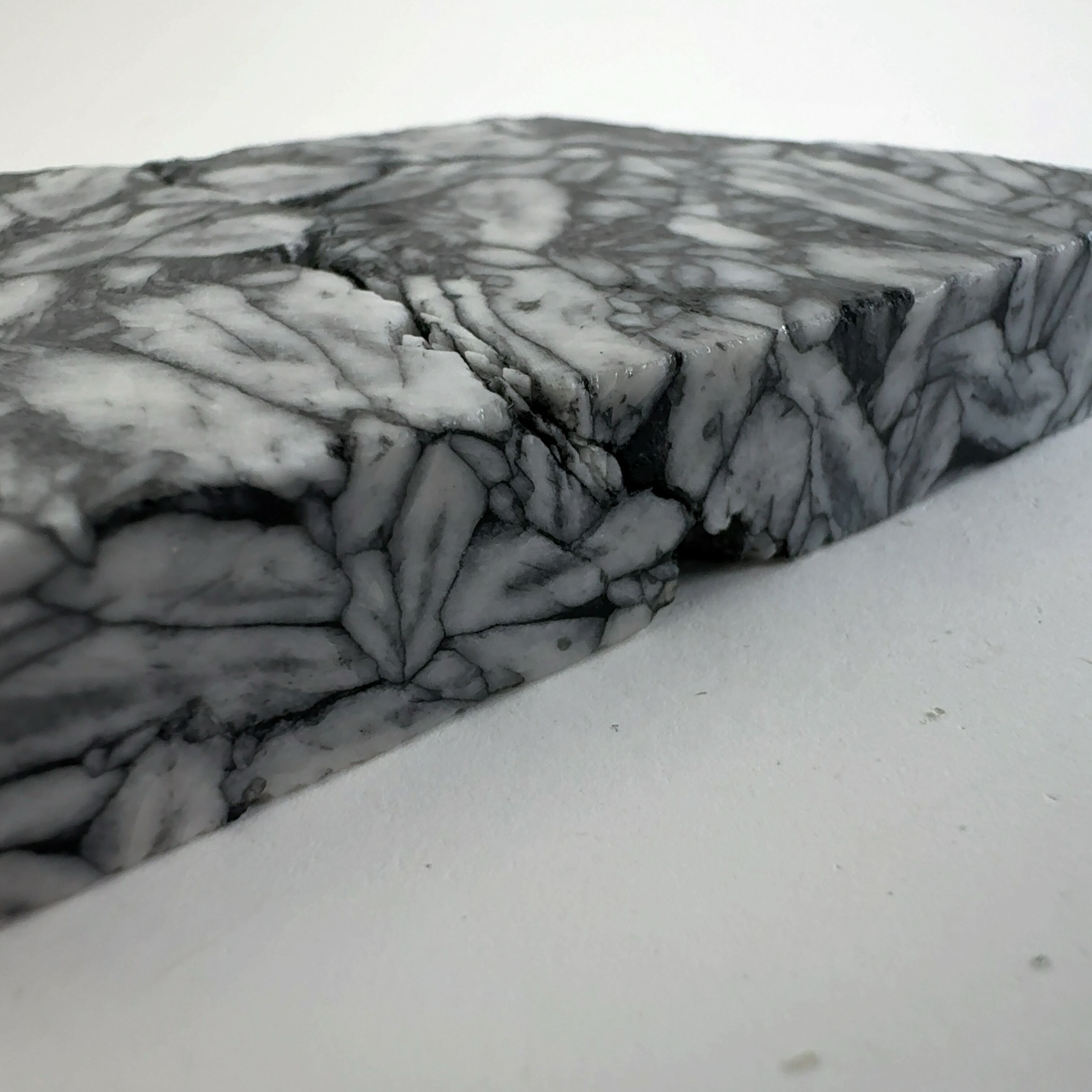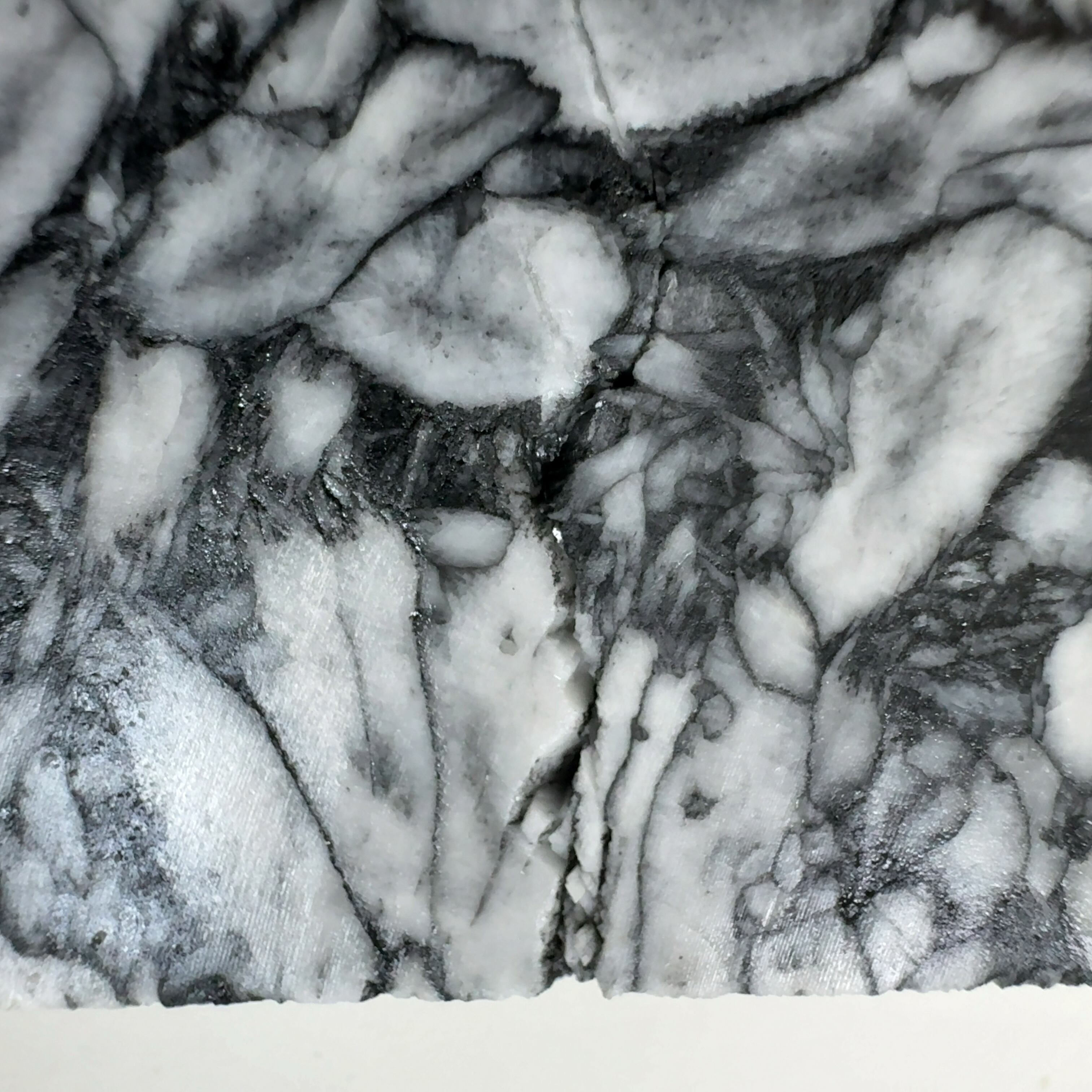 石墨に汚染された黒いドロマイトに含まれている、白色のマグネサイトの模様
